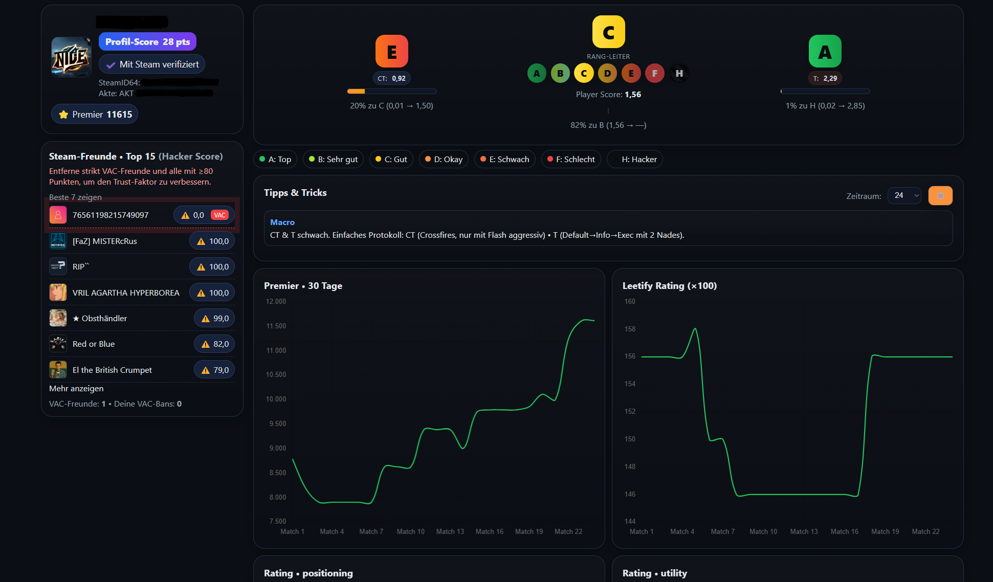 All essentials in one place — with a personal AI coach: live tips based on your recent performance (aim rhythm, positioning, clutch decisions). See trust-factor signals, VAC-banned friends, smurf/alt indicators, report history, ping/region, role distribution, map suggestions, weekly goals and notifications. Ideal to improve queue decisions and your game right away.